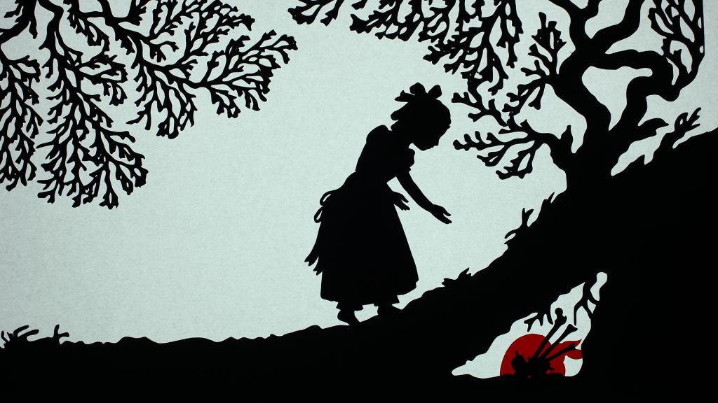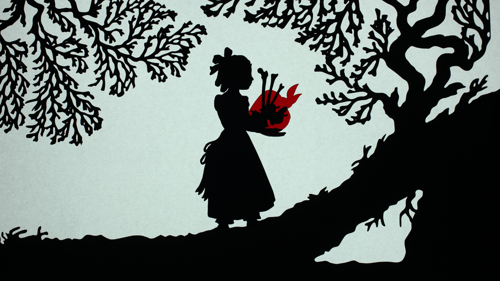 These past few weeks, I’ve been working on a grant application for a new animation project: an adaptation of a very dark and gory fairytale by the Brothers Grimm entitled The Juniper Tree (1812). Features child death, cannibalism, ghost-birds and violent revenge. In short, precisely my sort of thing. The proposed film will be created using paper cuts and articulated paper puppets, all done in a backlit, silhouette style perfect for this early 19th-century dark fairytale. Below is some concept art of the paper cutouts and puppets, shot on my light box.
