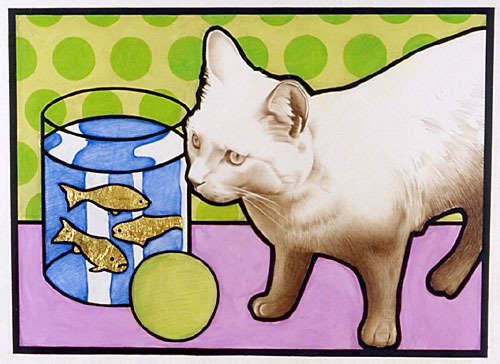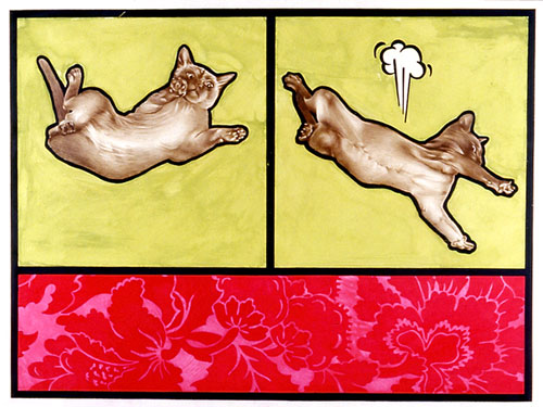 After the emotionally-wrought Bitter Seed series, I felt the need to create more light-hearted work. What could be more light-hearted than animals, I reasoned. This work conjured imagery often found in comics, graffiti, marketing & advertising and Anime, as well as in Pop Artists such as Roy Lichtenstein. Ironically, about half way into this series my course swerved significantly, and I began to create animal imagery addressing the plight of laboratory animals. So much for light-hearted.