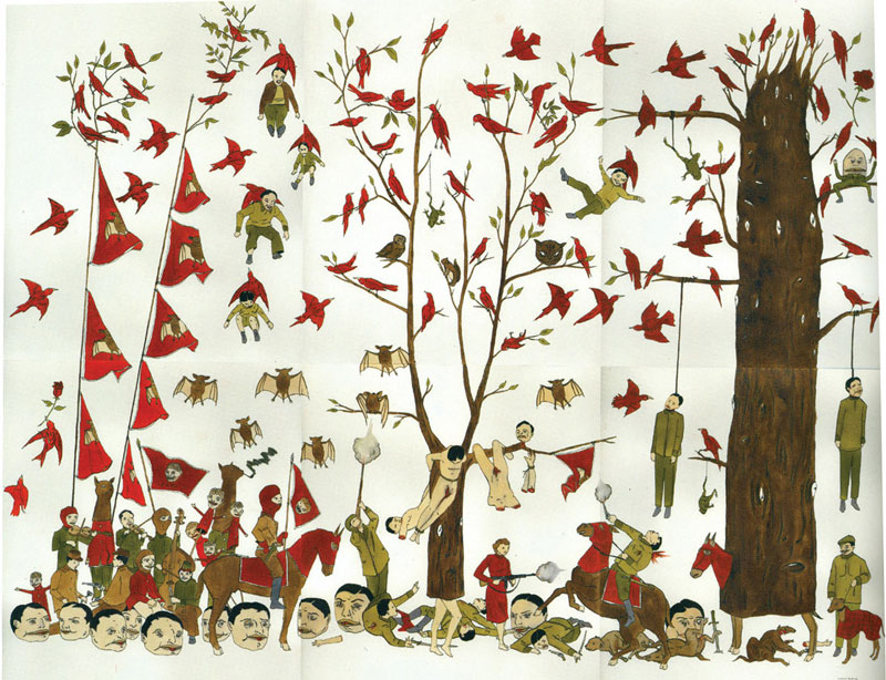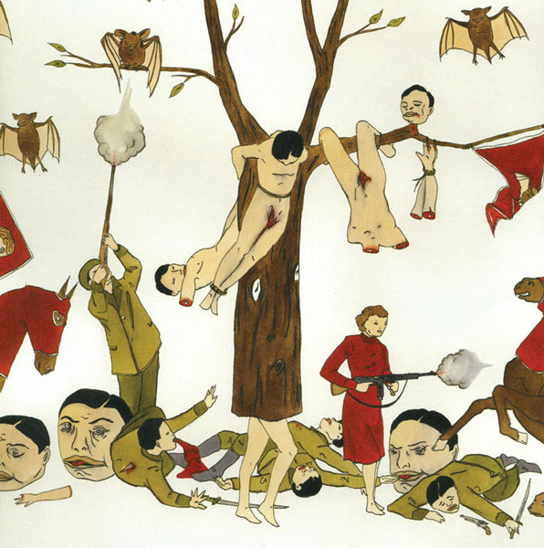 In her work prior to 2008, Boyle’s use of fairytales and mythological subjects tended to be global rather than specific. Her phantasmagoric imagery suggested the realm of dreams and myths without representing a particular legend or cultural tradition. Her two pencil and gouache drawings that we shall examine, both dating from 2003 and simply called Untitled, are evidence of her generalized incorporation of myth. Both drawings involve remarkable incidents in which a single female figure, isolated on the white void of the paper, quietly experiences a magical transformation. In Untitled (fig. 1) we are confronted with a woman in a bright red dress sitting contentedly in the grass, hands resting peacefully in her lap. The drawing is linear and economical; the grass on which the woman sits is minimally drawn. Two long, yellow plant stalks topped with white blossoms grow outwards from the eye sockets of the woman, a strange phenomenon that has not managed to disturb her serenity. The very fact that the woman appears unconcerned by this fantastic event seems to suggest that this transformation is metaphoric as the flowers are a manifestation of an interior psychological state. Equally, the woman may have simply acquiesced to the inevitability of this strange transformation. The subject of Boyle’s second drawing Untitled (fig. 2), a prepubescent girl whose rigid stance and sideways glance suggests that she’s somewhat more alarmed by the tangled bush growing out from her mouth, nevertheless seems to accept the strangeness of this event as normative.