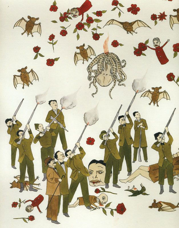 The victimization of the girl-child Persephone in The Bitter Seed is later redressed in my 2002 drawing St. Ursula and the Gorgon’s Head (fig. 6) in which I assumed the role of the Catholic Saint Ursula, the patron saint of schoolgirls. In a manner similar to The Bitter Seed, this drawing blended autobiographical elements with mythological role-playing in order to universalize personal experience. The heroine of St. Ursula and the Gorgon’s Head assimilates two divergent mythological traditions: the hagiography of the Catholic saint with the Greco-Roman myth of the Gorgon Medusa. More avenging angel than saint, St. Ursula is shown adorned with angel wings and holding aloft a sword and the severed head of Medusa. The mouth of the snake-haired Medusa gapes open in a silent scream while a magical bloom of red flowers bleed from the wound of the severed neck. In the background, graphic and highly stylized red flowers also appear to bleed. Much like the strange, sinister flowers of Boyle’s 2003 Untitled drawings, these violent blossoms subvert the traditional woman-nature dichotomy and the association of women with a passive and nurturing feminine principle.