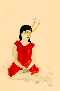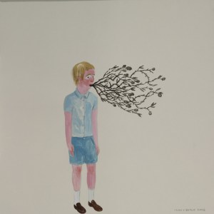 She sits there calmly, looking down upon the squalling infant in her arms with the serene expression of the Buddha. One wonders how she maintains her composure amidst the apparent cacophony that surrounds her. At her feet, six monstrous children sit. They have the soft, chubby limbs of toddlers and the featherless heads of baby birds. All are impeccably dressed: the boy children sport Victorian-era sailor suits with ruffled collars, while the girls wear dresses with short, puffed sleeves and a ribbon trim. Arms thrust upwards and heads tilted back, their beaks appear perpetually open in anticipation of sustenance. Or perhaps they are just squawking to attract their mother’s attention? With so many hungry, needy mouths, how does she continue to gaze serenely at her swaddled bird-baby? Even the ornate wallpaper that covers the wall behind her is patterned with the repeated motif of open, screaming mouths. The scene is strange, grotesque, and difficult to decipher.