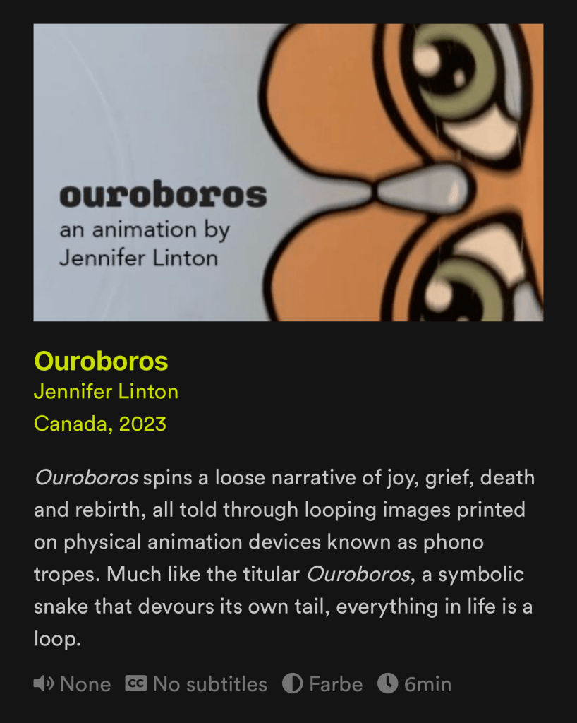 OUROBOROS is having its world premiere in Germany at the Internationale Kurzfilmwoche Regensburg (Regensburg International Short Film Week), March 16-26, 2023. My film opens the PARTYFILME program, so let’s drop that needle.