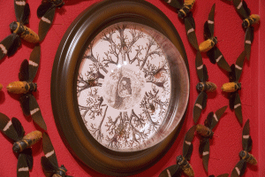 A pomegranate motif appears repeatedly throughout my Dollhouse. A highly stylized version of this fruit is featured in all of the stained-glass windows, and pomegranates adorn the wallpaper of the bedroom and the head and footboard of the bed. Two of the framed, miniature pictures that hang on the bedroom wall also contain the pomegranate. One of these framed pictures features a self-portrait, in which the curly locks of my hair transform into undulating, snake-like vines (fig. #10). These vines terminate in a single pomegranate, delicately suspended above my open palm. This self-portrait, however, makes only a vague reference to the pomegranate from the Persephone myth. Within the narrative of my current project, I no longer inhabit the role of this Greco-Roman goddess. The pomegranate serves not as a symbol of sexual subjugation – as it does within the Persephone myth – but rather as a symbol of female empowerment. The partially opened vulviform shape evident on the pomegranates throughout the Dollhouse make the linkage to female sexuality quite explicit.